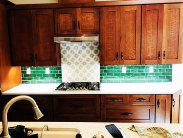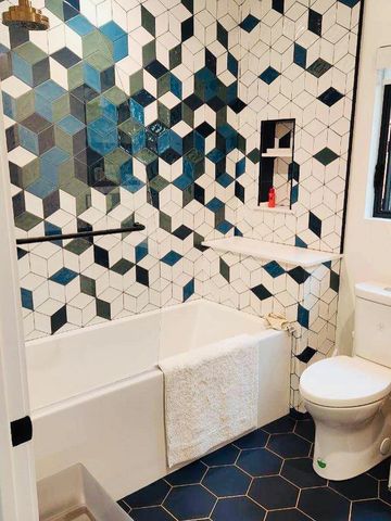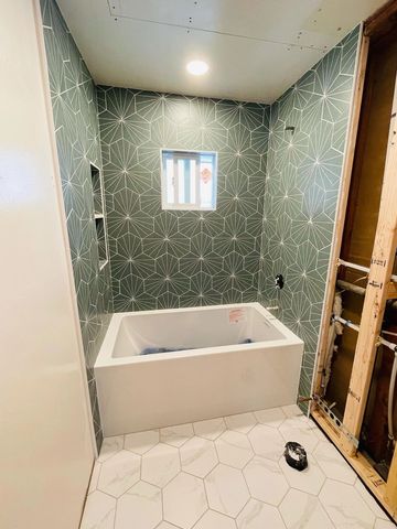 Here is an example of a tub/shower with a more labor intensive pattern. This also has a window and niche. These types of installations take more time and truly look amazing as the pattern gets folded into each corner like wallpaper.